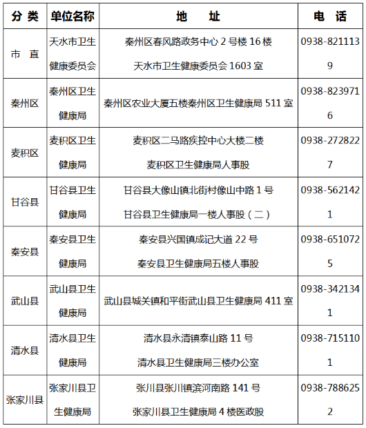 天水市2021年度卫生(护士)专业技术资格证书已下发各单位、县区,请成绩合格人员及时到报考资格确认地点领取证书。具体联系方式见附表。