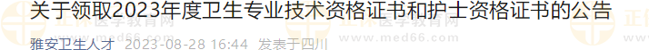 雅安卫生人才发布关于领取2023年度初级护师资格证书的公告,医学教育网整理具体内容如下: