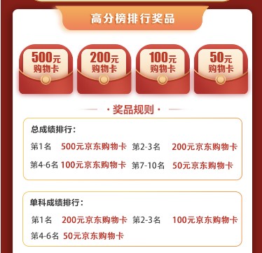 (2)单科成绩:第1名200元京东卡、第2-3名100元京东卡、第4-6名50元京东卡。