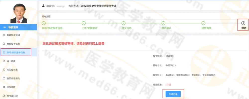 点击报考流程上的“缴费”节点或左侧【网上缴费】,核对报考专业、科目和金额,确认无误后点击“生成订单”跳转至订单页,再点击“支付”跳转至考区指定的缴费平台。