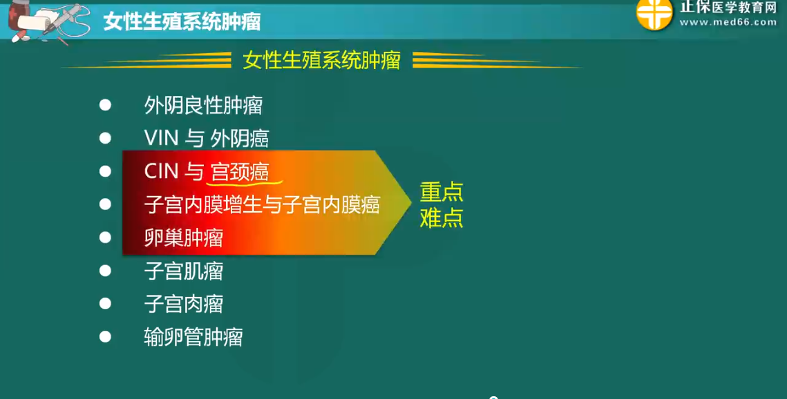 妇产科主治医师中涉及的女性生殖系统肿瘤的考点有外阴良性肿瘤、VIN与外阴癌、CIN与宫颈癌、子宫内膜增生与子宫内膜癌、卵巢肿瘤、子宫肌瘤、子宫肉瘤、输卵管肿瘤等。但并不是说每个肿瘤的考试占比都相同,其中考察最多的有宫颈癌、子宫内膜癌、卵巢肿瘤。这就需要我们分配好时间,跟着老师合理复习。