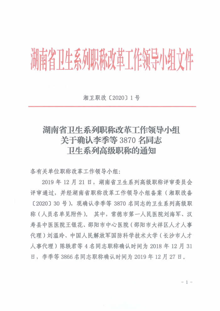 湖南省关于确认李季等3870名同志卫生系列高级职称的通知由医学教育网小编为您汇总,想要知道自己是否通过了?赶紧来点击查看吧!