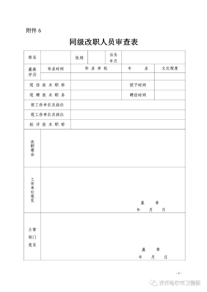 同级改职人员需提供《同级改职人员审查表》( 附件6), 申报单位人事部门要在《专业技术职务任职资格评审表》右上方注明“改职”字样。