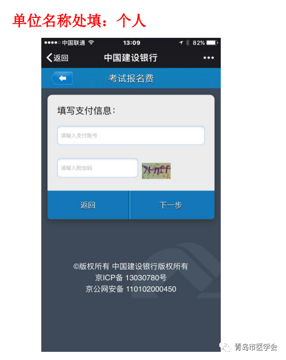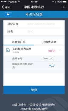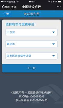 (1)找到缴费项目。登录建行最新版手机银行客户端,选择菜单栏“悦生活”→“行政教育”→“考试报名费” ,选择“山东省青岛市” →“国家医师资格考试费”,点击“下一步”