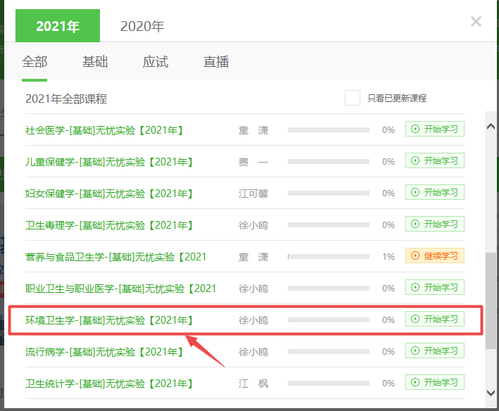 开课啦!2021年公卫执业医师考试徐小鸥老师《环境卫生学》基础学习班新课更新!已购课同学可以直接进入我的网校我的家-我的课程-环境卫生学科目进行学习!未购课学员点击此处进入选择,具体看课位置如下:
