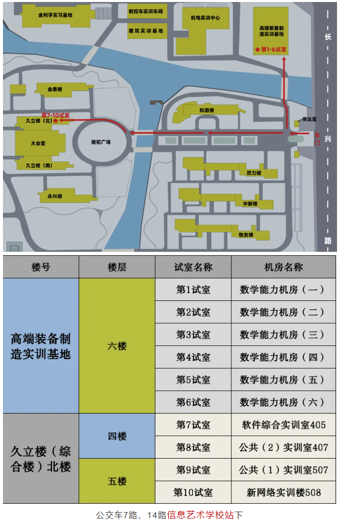 2.按准考证上的时间提前1小时进校等候,第1-6试室考生休息室在高端装备制造实训基地一楼,第7-10试室考生休息室在久立楼(综合楼)北楼三楼。