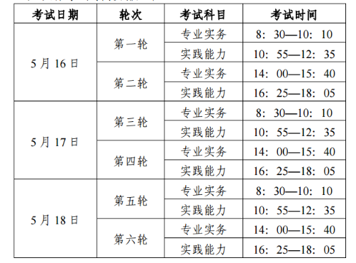 考试科目为专业实务和实践能力,采用人机对话方式进行考试。具体考试时间安排如下: