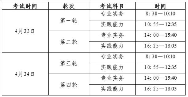 考试分为4轮次进行,每半天为一个轮次,考生将随机分配至其中一个轮次参加专业实务和实践能力两个科目的考试,具体考试时间以准考证为准。