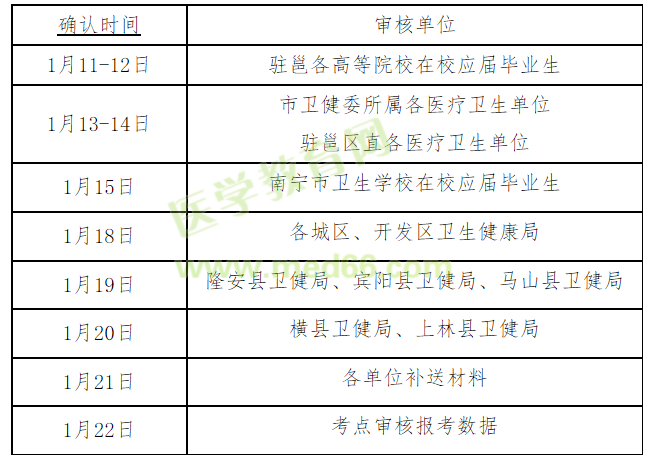 南宁市考点根据工作安排,现场确认时间安排在2021年1月11日-22日期间进行(节假日、双休日除外),上午08:00-12:00;下午15:00-18:00。
