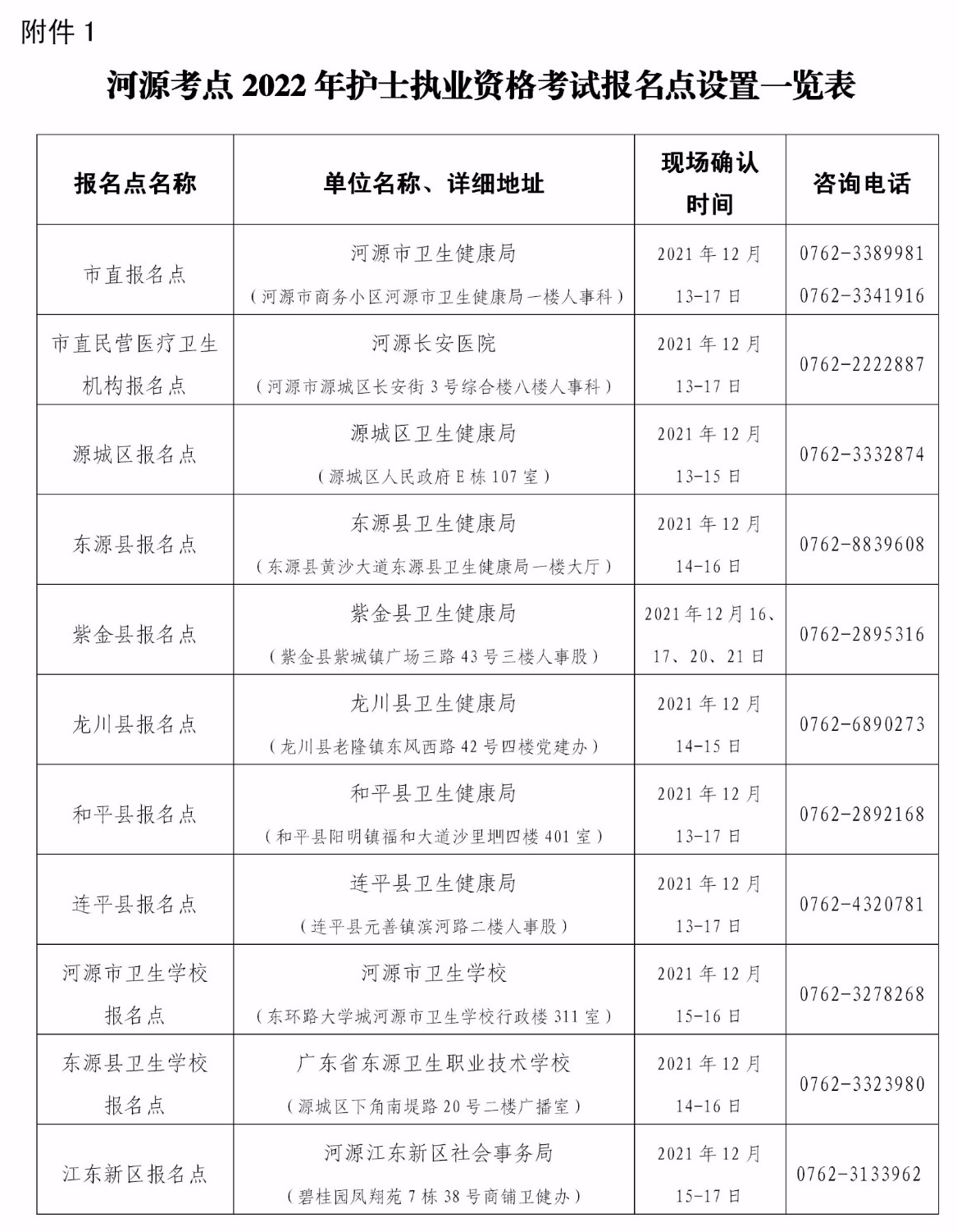 附件:1.河源考点2022年护士执业资格考试报名点设置一览表