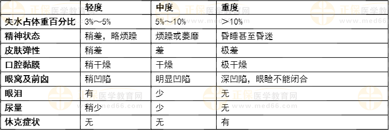 【解答】不同程度的脱水的临床表现如下,可通过皮肤弹性、尿量和精神状态等进行区分。