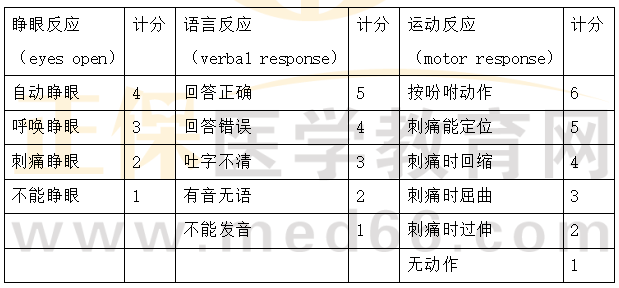 【解答】在格拉斯哥评分表中,[医学教育网原创]睁眼反应(eyes open),语言反应(verbal response),运动反应(motor response)。
