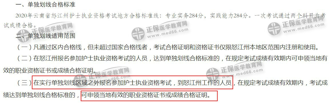 并且,有些地区单独合格分数线福利外地考生也可以申请,【医学教育网原创·转载请注明出处!】以云南怒江州2020护士单独分数线通知为例。不是在云南怒江州报名参加考试,但是在怒江州工作的考生,也可以按照单独分数线标准申请护士资格证书。点击查看详情>>