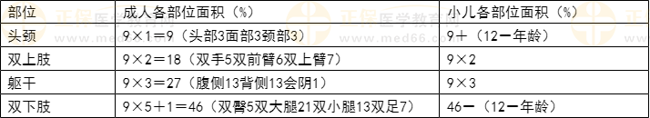 中国新九分法适用于较大面积烧伤的评估。该法将体表面积分为11个9%,另加会阴区的1%,构成100%的体表面积。12岁以下小儿头部面积较大,双下肢面积相对较小,测算方法应结合年龄进行计算(见下表)。