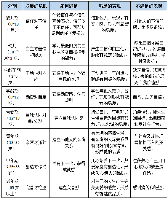 艾瑞克森强调文化及社会环境在人格发展中的重要作用,认为人的发展包括生物、心理、社会三方面的变化过程,此过程有八个发展阶段组成,每一阶段都有一个发展危机或中心任务必须解决,成功地解决每一个阶段的危机,人格才会顺利发展。