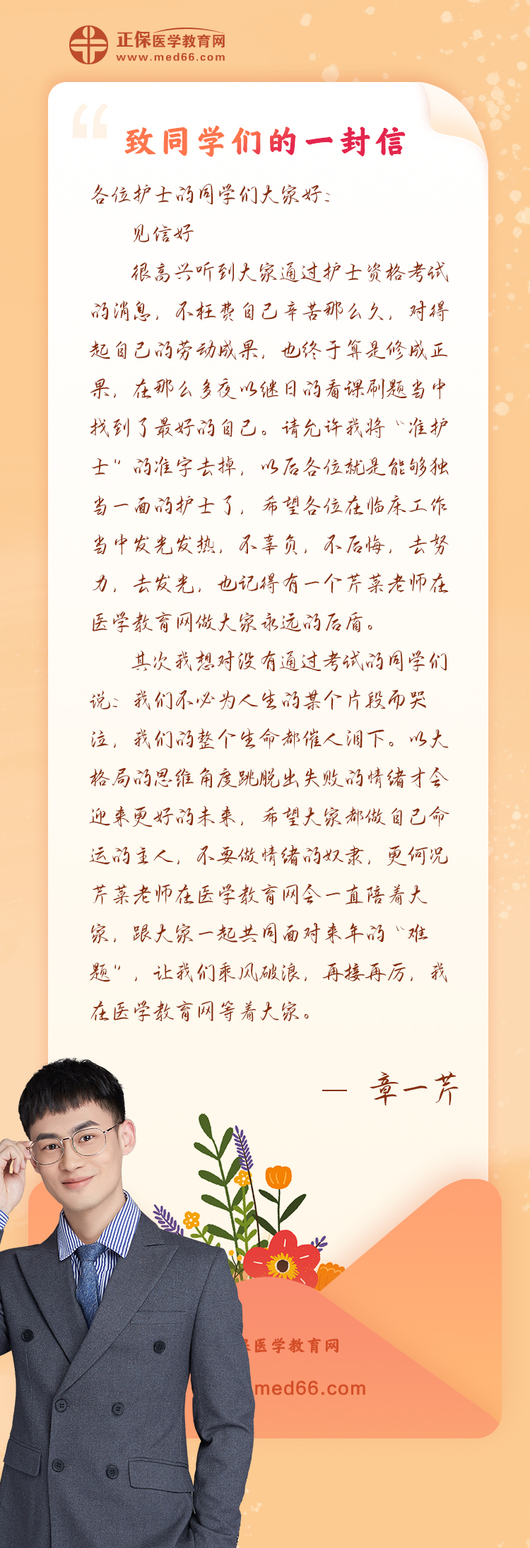 2023年护士考试成绩查询入口开通(快速查分>>)后,网校收到了众多考生的喜报,消息的窗口一个个地从手机上弹出来,微信语音电话、视频电话也响个不停,隔着屏幕都能感受到的喜悦,祝所有考生都考出好成绩!除了分享成功过关的喜悦外,还有对网校、老师、服务团队等数不尽的感谢!此时除了通过考试开心的考生们,医学教育网老师们也在心心念念着各位同学,各位老师纷纷为大家送上了“致同学们的一封信”,快来看看章一芹老师都对我们说了哪些内容:
