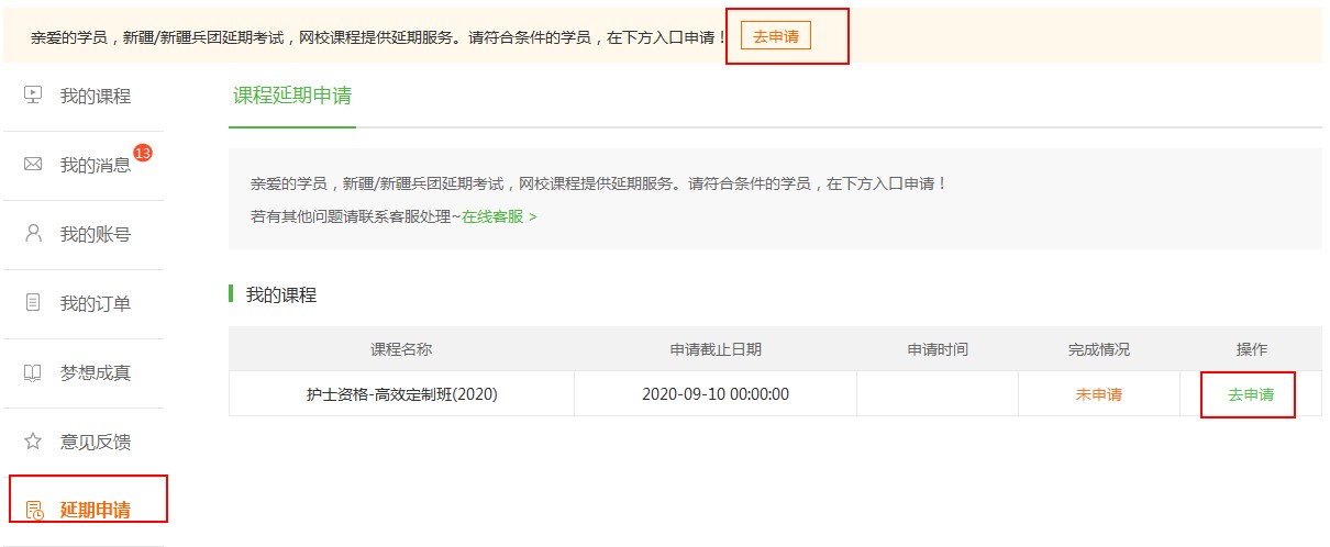 (1)在“我的网校我的家”中(我的家入口>),点击“延期申请”或上方的“去申请”→“选择你想要申请延期的订单”→点击“去申请”。