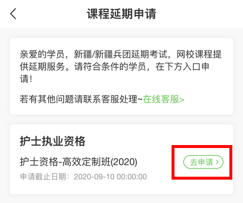 根据地区官方通知内容:新疆/新疆兵团考区2020护士资格考试延期,医学教育网针对延期考试地区的学员,免费延迟关课时间至正式考试后一周(考前均可正常看课)!申请入口已开通,具体操作流程及方法如下:
