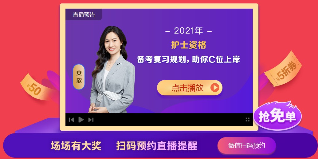 11月6日(周五)晚19:30-21:00安欣老师准时邀请你参加护士免费直播,赢取5折秒杀高效定制班,还有更多好礼等你拿!