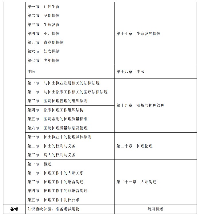 考核内容:与护士执业相关的法律法规:护士条例、护士注册管理办法、传染病防治法、侵权责任法、医疗事故处理条例、献血法和医疗机构从业人员行为规范等。