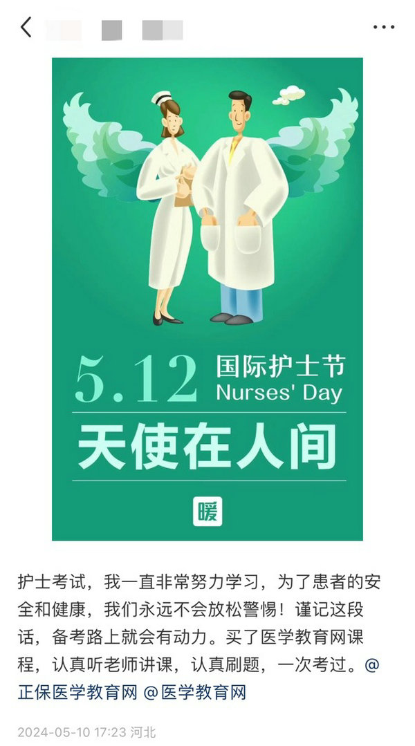 2024年护士节来临之际,医学教育网特别策划《国际护士节特别活动》活动,各地的护理工作者们纷纷参与,分享自己在工作中的感受与经历,一起来看看大家都说了什么吧!点击2024年护士节这样过!多渠道联动,医学教育网惊喜好礼送不停!留言互动,参与有奖!