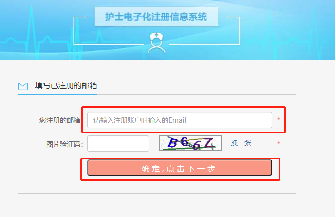 ③在打开的“填写已注册的邮箱”页面中,输入您电子化注册系统中完成验证的“电子邮箱”,正确录入“验证码”后点击“确定,点击下一步”。