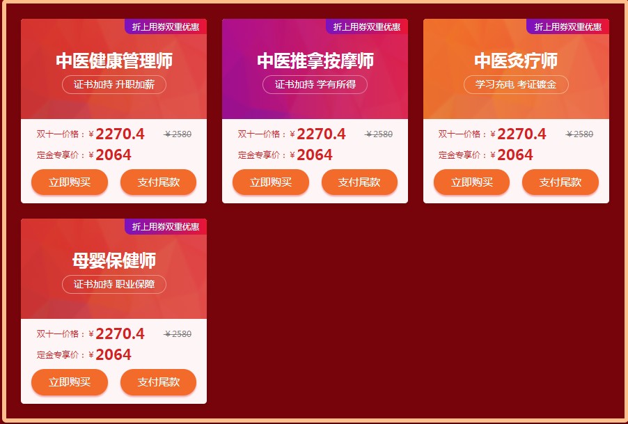 “爽”11购课季,医学教育网特别推出中医健康管理师好课8折需要“两步走”——11月9日23:59:59之前付定金、11月11日23:59:59之前完成付尾款,现在正在火热进行中!今天可以付尾款了哦~~