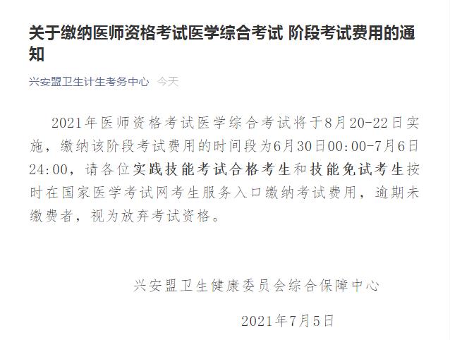 2021年医师资格考试医学综合考试将于8月20-22日实施,缴纳该阶段考试费用的时间段为6月30日00:00-7月6日24:00,请各位实践技能考试合格考生和技能免试考生按时在国家医学考试网考生服务入口缴纳考试费用,逾期未缴费者,视为放弃考试资格。