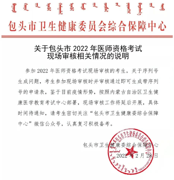 包头市卫健委综合保障中心关于2022年医师资格考试报名资格现场确认工作的公告