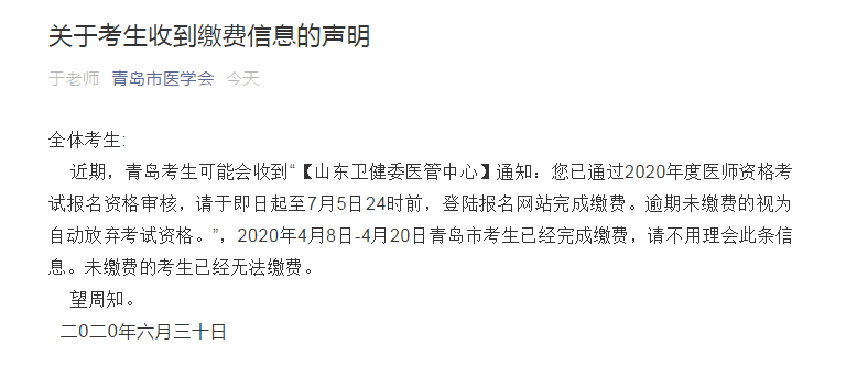 近期,青岛考生可能会收到“【山东卫健委医管中心】通知:您已通过2020年度医师资格考试报名资格审核,请于即日起至7月5日24时前,登陆报名网站完成缴费。逾期未缴费的视为自动放弃考试资格。”,2020年4月8日-4月20日青岛市考生已经完成缴费,请不用理会此条信息。未缴费的考生已经无法缴费。