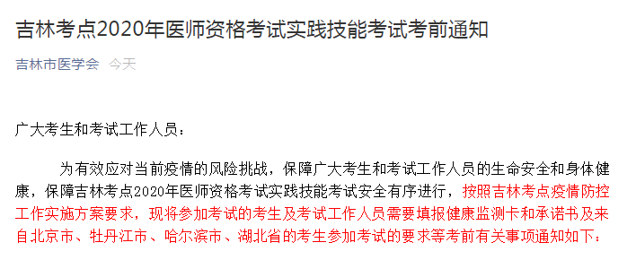 为有效应对当前疫情的风险挑战,保障广大考生和考试工作人员的生命安全和身体健康,保障吉林考点2020年医师资格考试实践技能考试安全有序进行,按照吉林考点疫情防控工作实施方案要求,现将参加考试的考生及考试工作人员需要填报健康监测卡和承诺书及来自北京市、牡丹江市、哈尔滨市、湖北省的考生参加考试的要求等考前有关事项通知如下: