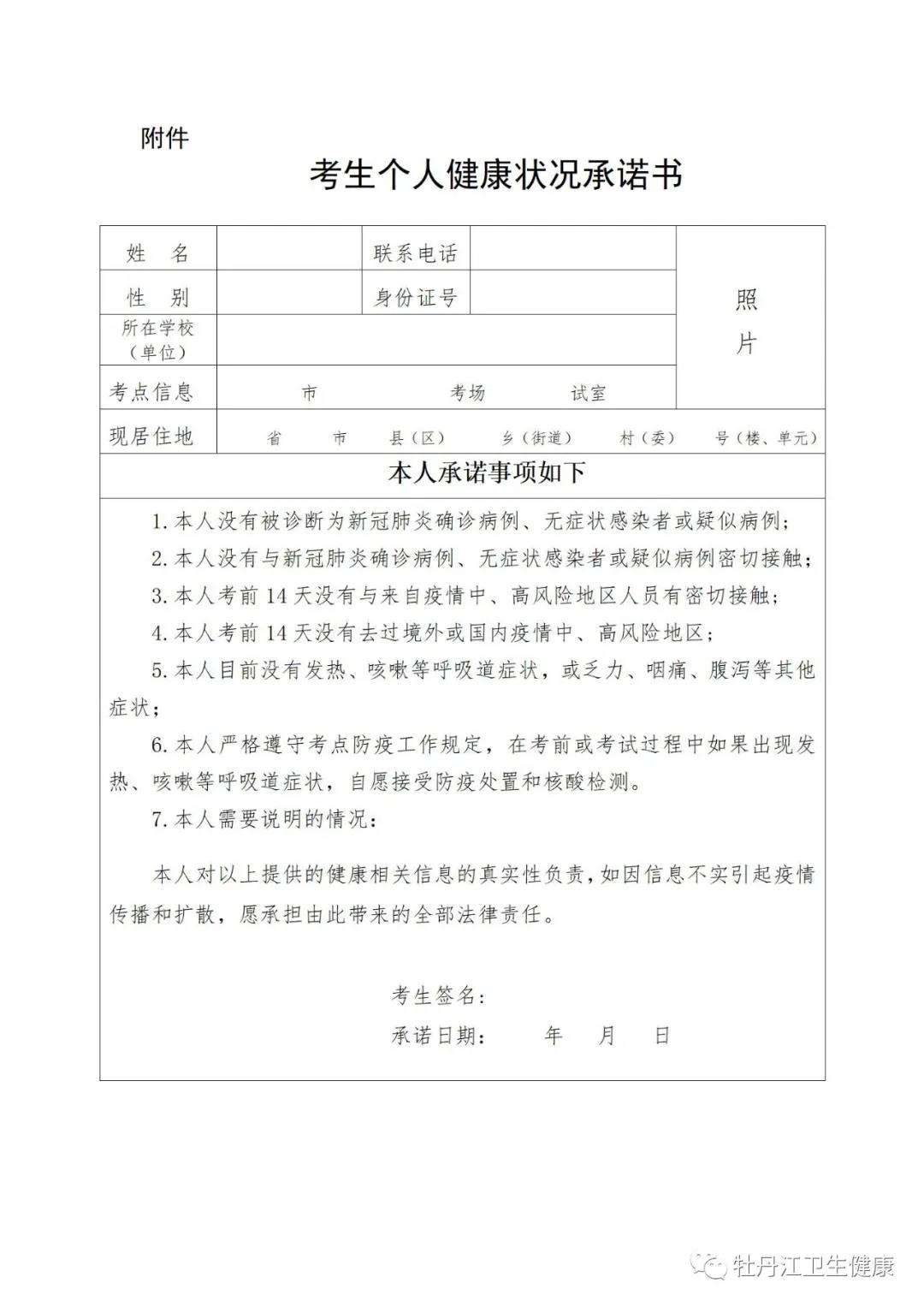 2.考生必备6要件:所有考生须持①准考证考试时间最后一天有效的7日内核酸检测报告(费用自理);②有效身份证原件;③准考证(彩色打印、照片清晰);④考生个人健康状况承诺书(见附件),按要求填写完整并贴照片,不得空项;⑤现场扫“行程码”、“龙江健康码”;⑥个人防护用品(一次性医用外科口罩、一次性手套、速干手消毒剂,自行准备透明文具袋存放防护用品)。