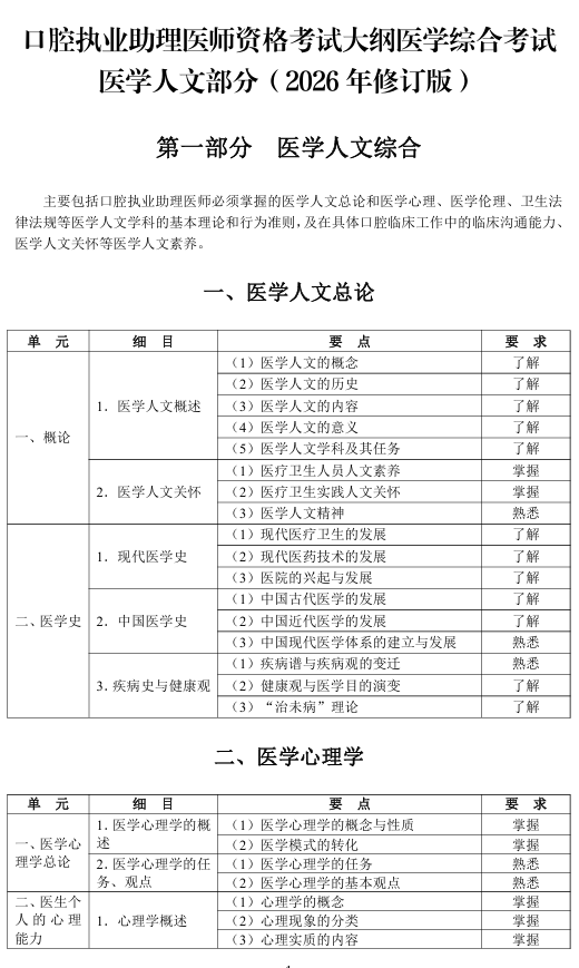 国家卫健委官方发文,2026年口腔助理医师考试《医学人文》大纲内容有修订。医学教育网小编专门整理了2026年口腔助理医师《医学人文》修订版大纲下载如下,各位考生赶快收藏起来!
