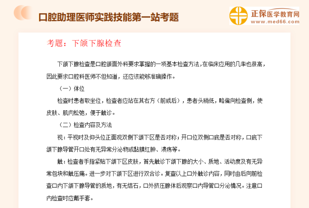 下颌下腺检查——口腔助理医师实践技能【口腔检查】历年常考知识点