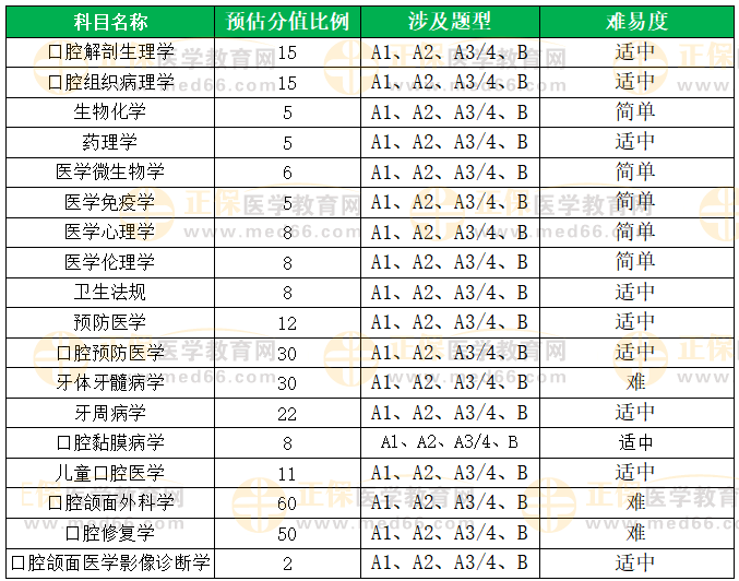 题目的考察深度加深,考生不能只懂症状体征、治疗方法,还要理解背后机制。对于口腔三大主科目,比如牙体牙髓病学、修复学的题目难度增加,题干变长且考察的较灵活,更加符合国家对临床型人才的考察标准。口腔颌面外科学则考察的相对直接,涉及的考点都是基础知识点,考生更容易做出判断。其他副科题目难度适中,医学人文较为简单,更易得分。