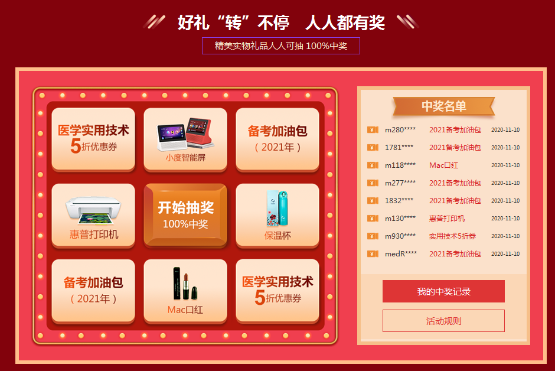 爽11钜惠倒计时!购课不要忘记幸运大转盘抽奖!小度智能屏、惠普打印机、正保定制保温杯、Mac口红、医学实用技术5折优惠券、2021备考内部资料包等你拿哦!