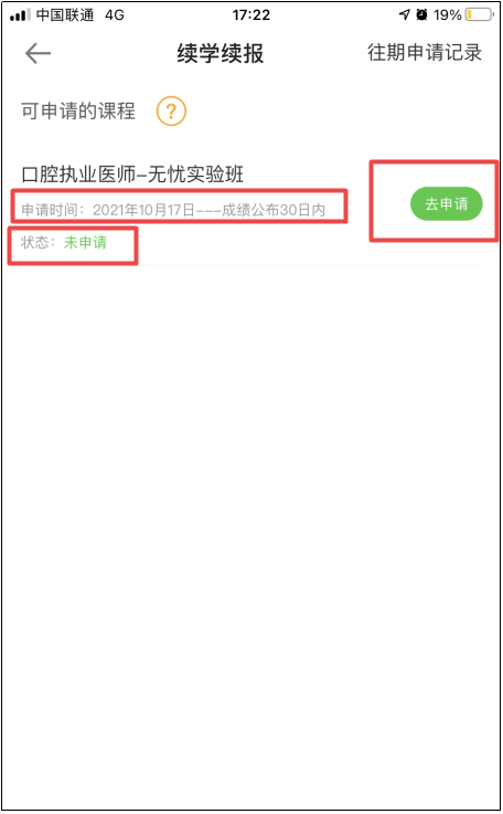 2.进入续学续报页面后,会显示学员可申请续学的课程、申请状态及申请续学的时间段,点击对应课程右侧的【去申请】按钮;