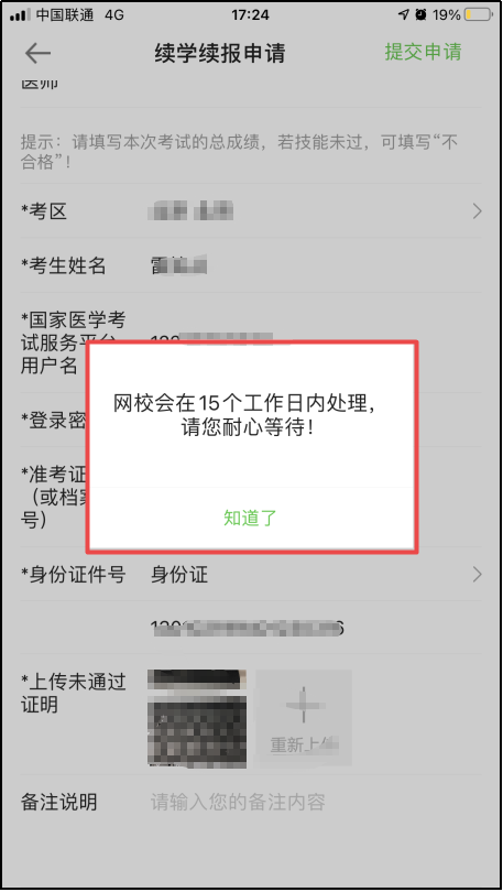 5.此次页面会自动弹出提醒:“网校会在15个工作内处理,请您耐心等待!”,看到此消息,说明您已经成功提交申请!