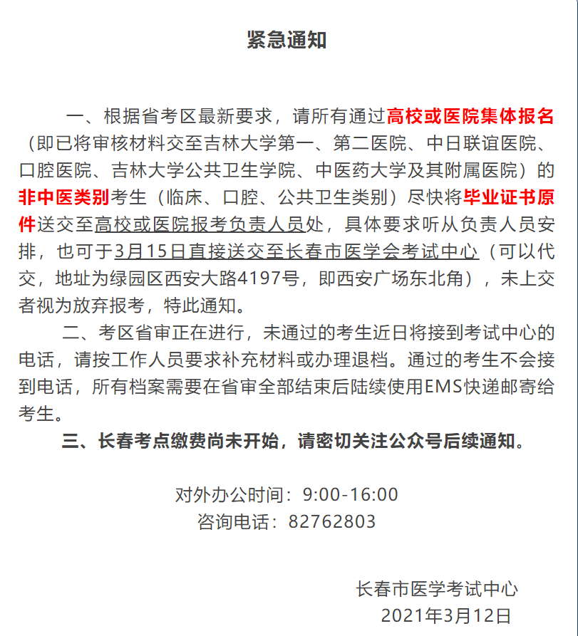 一、根据省考区最新要求,请所有通过高校或医院集体报名(即已将审核材料交至吉林大学第一、第二医院、中日联谊医院、口腔医院、吉林大学公共卫生学院、中医药大学及其附属医院)的非中医类别考生(临床、口腔、公共卫生类别)尽快将毕业证书原件送交至高校或医院报考负责人员处,具体要求听从负责人员安排,也可于3月15日直接送交至长春市医学会考试中心(可以代交,地址为绿园区西安大路4197号,即西安广场东北角),未上交者视为放弃报考,特此通知。