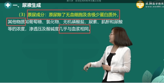 原尿成分:原尿除了无血细胞及含极少蛋白质外,其他物质如葡萄糖、氯化物、无机磷酸盐、尿素、肌酐和尿酸等的浓度,渗透压及酸碱度几乎与血浆相同。