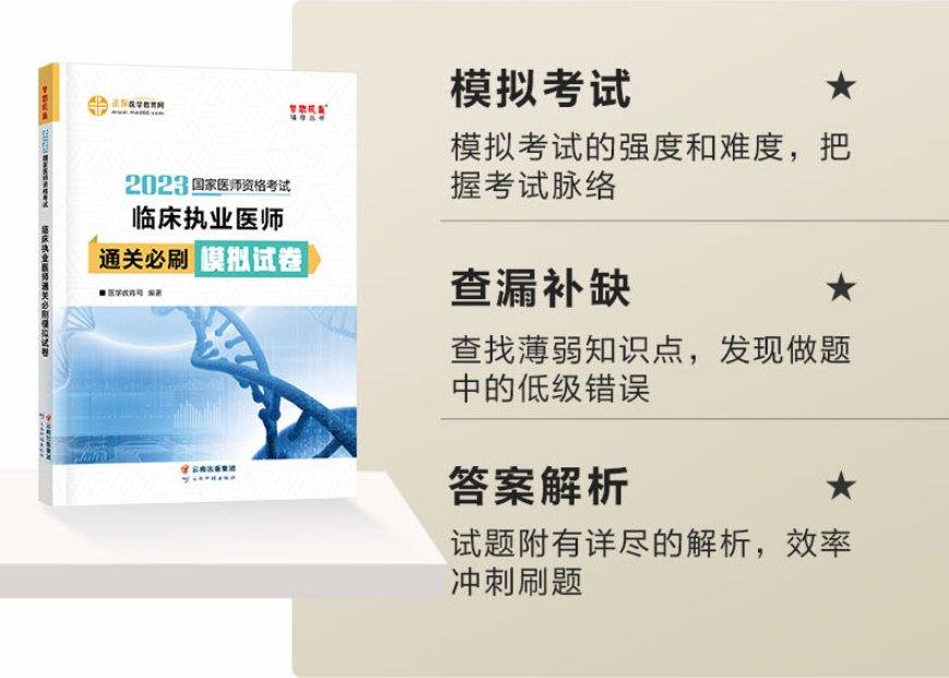 以上分享的“2023年临床执业医师通关必刷模拟试卷纸质书(5折现货热卖)”内容,由医学教育网小编搜集整理,如果您觉得对您有所帮助,可以分享给朋友。想了解更多医学考试信息、复习资料、备考干货请关注医学教育网。