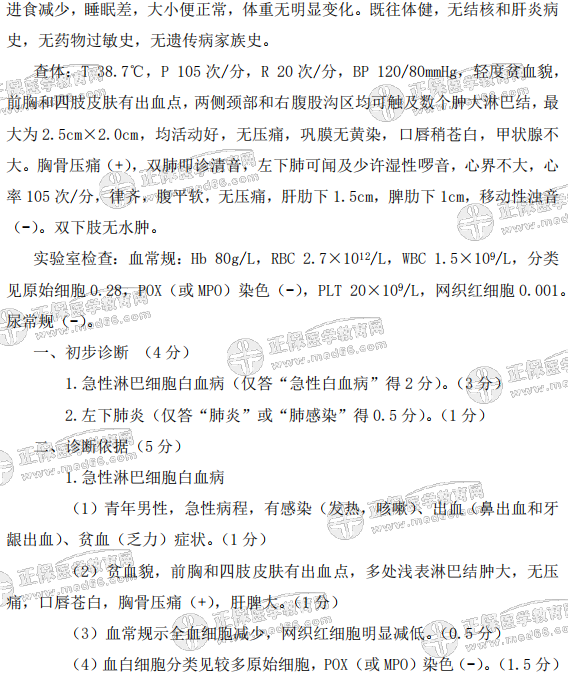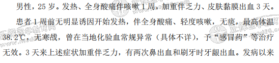 男性,25岁。发热、全身酸痛伴咳嗽1周,加重伴乏力、皮肤黏膜出血3天...为了方便各位考生熟悉临床执业医师实践技能考试题型及出题方式,评分标准等,医学教育网编辑为大家整理临床执业医师实践技能考试病例题,并附了详细评分标准!可参考复习。