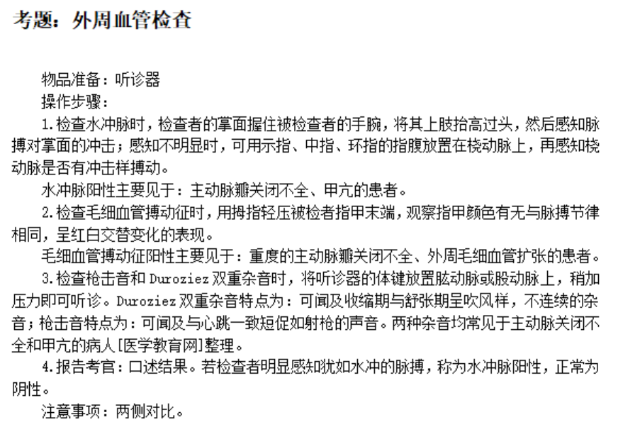外周血管检查操作步骤及注意事项——临床医师技能历年考点如下,实践技能第二站体格检查是考试难点之一,为了帮助广大医考生学习,医学教育网老师专门总结了“体格检查”历年考点,预祝大家都能取得优异成绩: