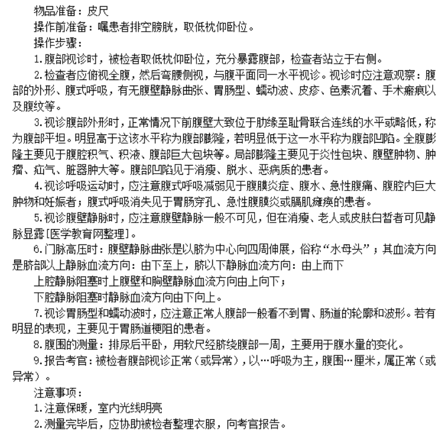 腹部视诊操作步骤及注意事项——临床执业医师体格检查历年考点如下,实践技能第二站体格检查是考试难点之一,为了帮助广大医考生学习,医学教育网老师专门总结了“体格检查”历年考点,预祝大家都能取得优异成绩: