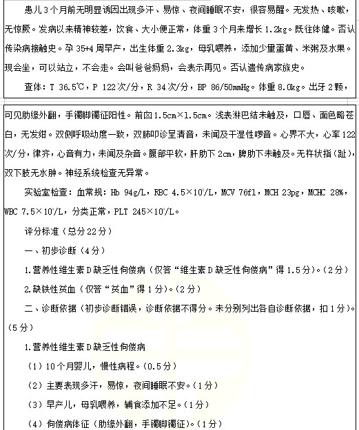 维生素D缺乏性佝偻病考点例题:女婴,10个月。多汗、睡眠不安3个月。2022年临床医师实践技能考试正在进行中,医学教育网编辑预祝各位考生顺利参考,取得好成绩!