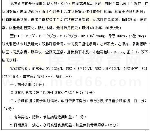 考点例题:男性,67岁。间断反酸、烧心6年,症状频繁发作伴胸痛1个月。