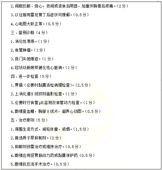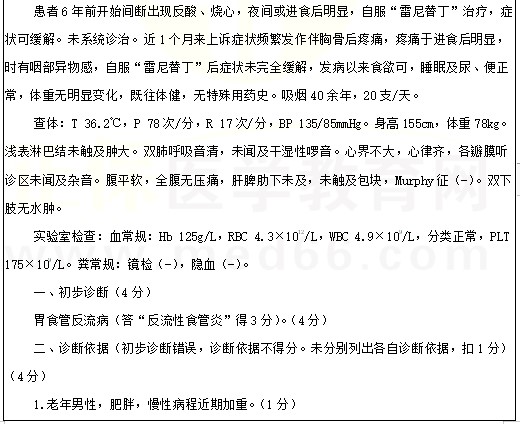 考点例题:男性,67岁。间断反酸、烧心6年,症状频繁发作伴胸痛1个月。