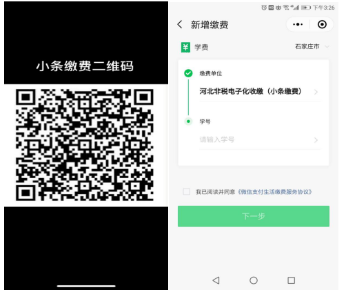 2、通过微信扫描“小条缴费二维码”,进入以下缴费界面,其中“学号”位置输入“缴费码”,点击“我已阅读并同意”,再点击“下一步”即可缴费。