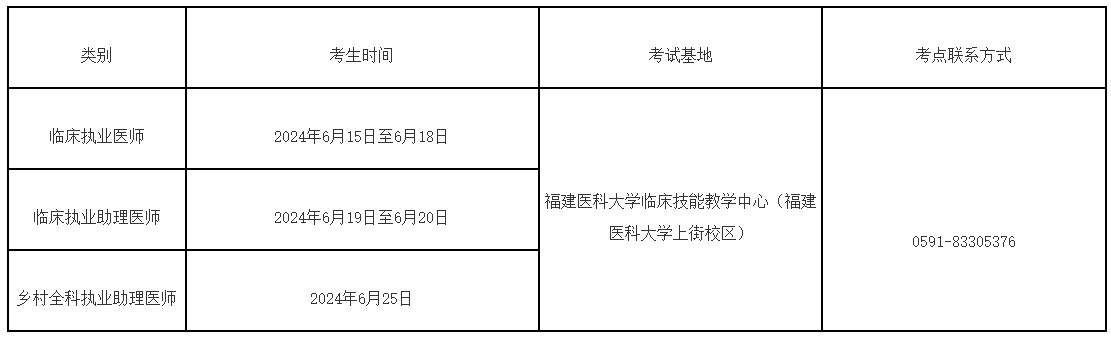 2024年国家医师资格实践技能考试福州考点考试将于2024年6月15日-20日(临床类别)、25日(乡村全科类别)举行。为做好考试期间有关工作,现将福州考试期间有关要求告知如下,请全体考生遵守执行。