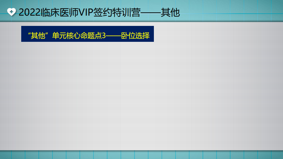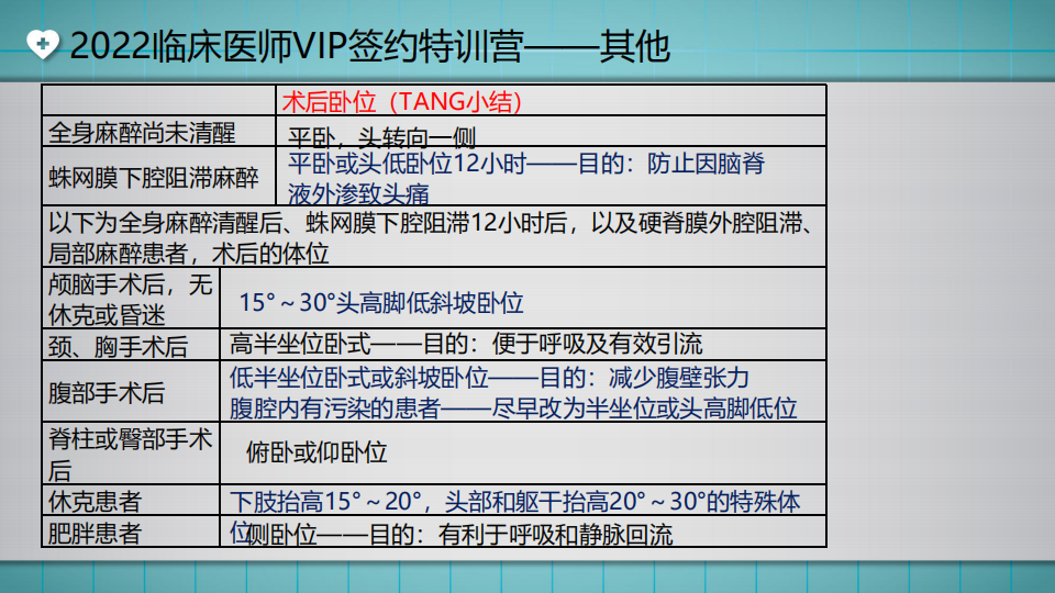 术后卧位——《其他》单元核心考点(汤以恒讲义)如下,汤以恒老师4月25日开展了VIP强化特训公开课,参与直播的同学热情高涨,都是干货,全是精髓! 错过直播的同学可以看直播回放>>,现在将精彩讲义内容摘取如下,没有参加直播的同学,也可以一睹为快啦!